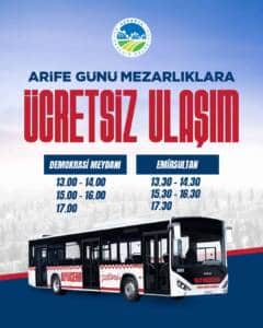 Arefe günü saat 13.00 itibariyle başlayacak olan ücretsiz otobüsler, her saat başı Demokrasi Meydanı‘ndan hareket ederek Emirdağ ve Emir Sultan Mezarlıklarına vatandaşları taşıyacak. Seferler, 17.00‘ye kadar devam edecek.