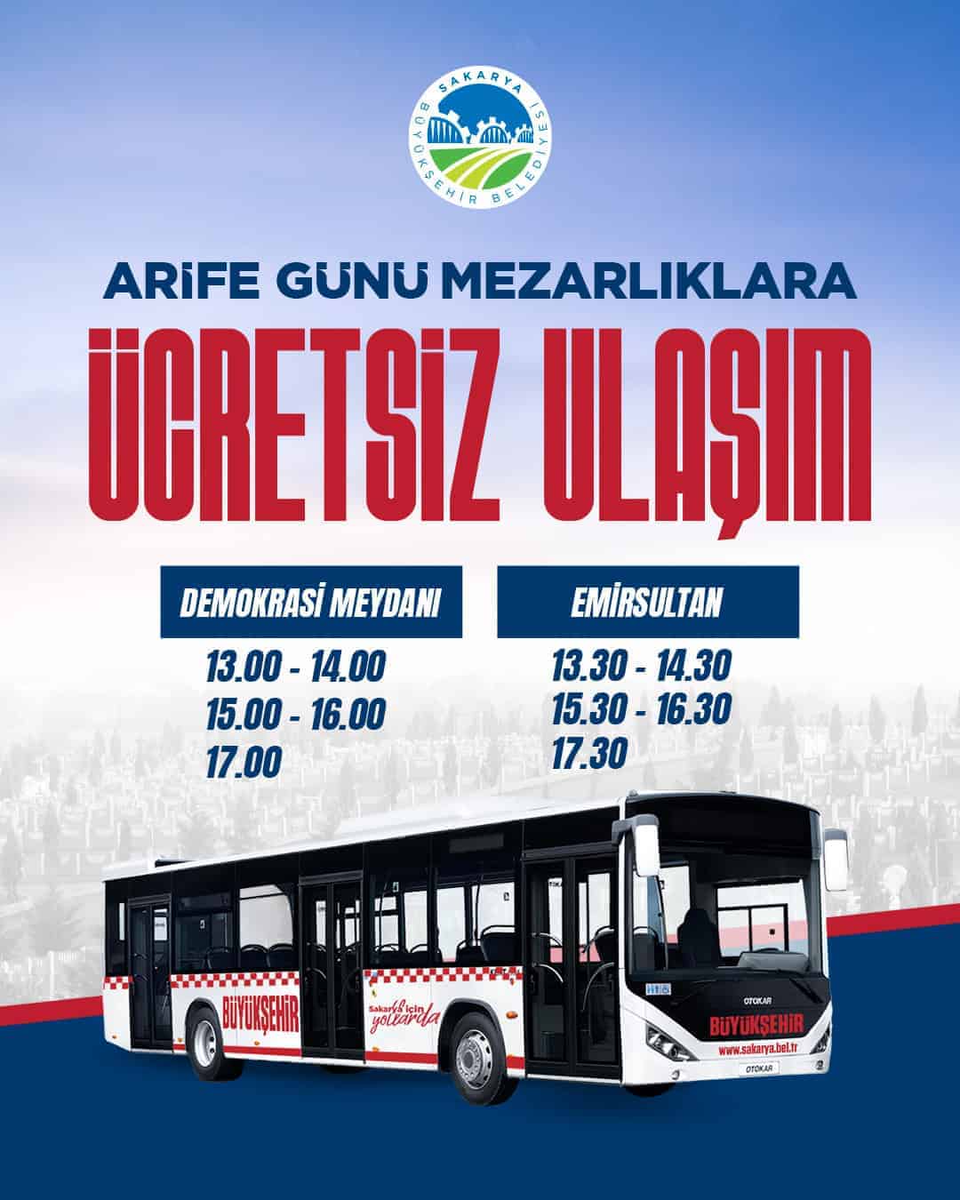 Sakarya Büyükşehir Belediyesi, Ramazan Bayramı arefesinde mezarlıkları ziyaret etmek isteyen vatandaşlara ücretsiz ulaşım hizmeti sağlayacak.